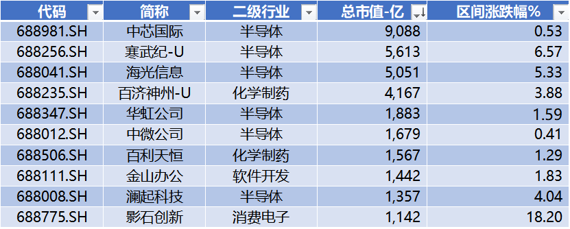 上图是本周科创板前十大权重公司呈现普涨,其中影石创新涨幅居前,中微公司居末。