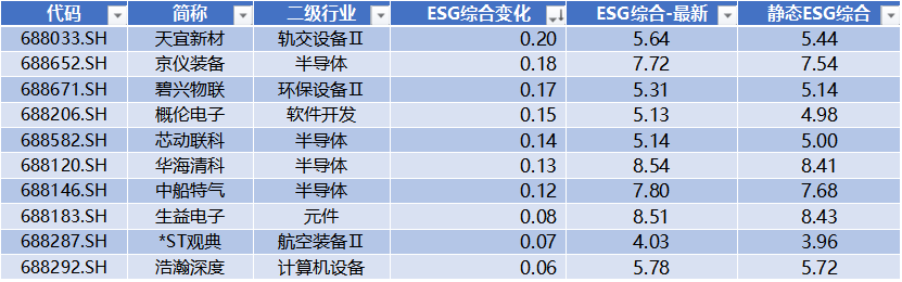 上表是ESG评分变化上升的前十家公司(剔除新上市公司),分别为:天宜新材、京仪装备、碧兴物联、概伦电子、芯动联科、华海清科、中船特气、生益电子、*ST观典、浩瀚深度。