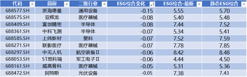 上表是ESG评分变化下降的前十家公司,分别为:浙海德曼、亚辉龙、富创精密、中科飞测、上纬新材、联影医疗、中无人机、ST思科瑞、威高骨科、阿特斯。