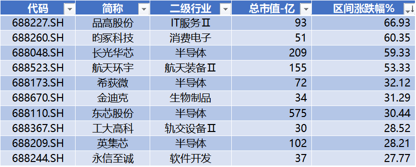 上表是本周涨幅榜前十公司,排名前十的公司分别是:品高股份、昀冢科技、长光华芯、航天环宇、希荻微、金迪克、东芯股份、工大高科、英集芯、永信至诚。