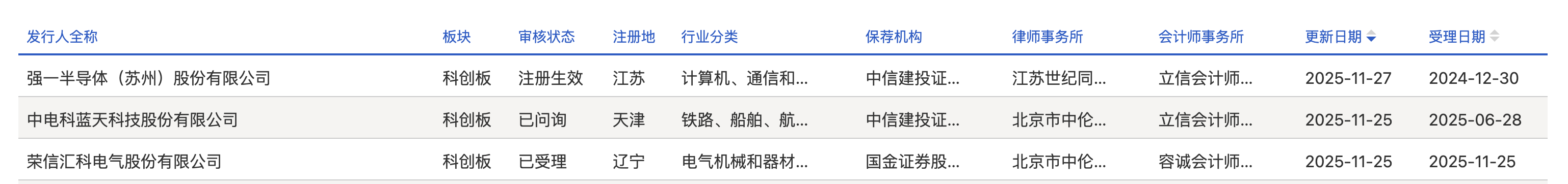 荣信汇科科创板IPO在11月25日获受理;电科蓝天更新第二轮审核问询回复;强一股份证监会注册生效。