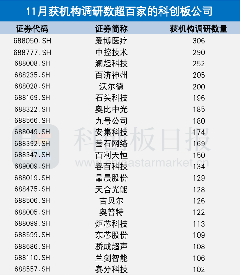 《科创板日报》12月1日讯(记者 黄修眉)财联社星矿数据统计显示,11月1日至30日,共287家科创板公司获得机构调研,有21家公司获得机构调研数量超百家。