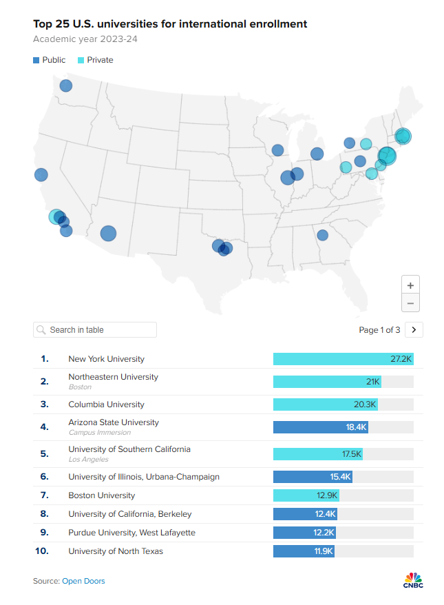 据统计,在2023-2024学年,纽约大学、西北大学和哥伦比亚大学的国际学生均超过2万人。