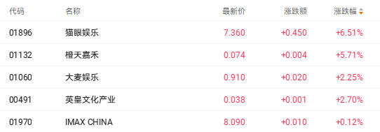 财联社12月1日讯(编辑 胡家荣)受益于优质进口片催化,港股影视板块表现活跃。截至发稿,猫眼娱乐(01896.HK)涨6.51%、橙天嘉禾(01132.HK)涨5.71%、大麦娱乐(01060.HK)涨2.25%、英皇文化产业(00491.HK)涨2.70%。