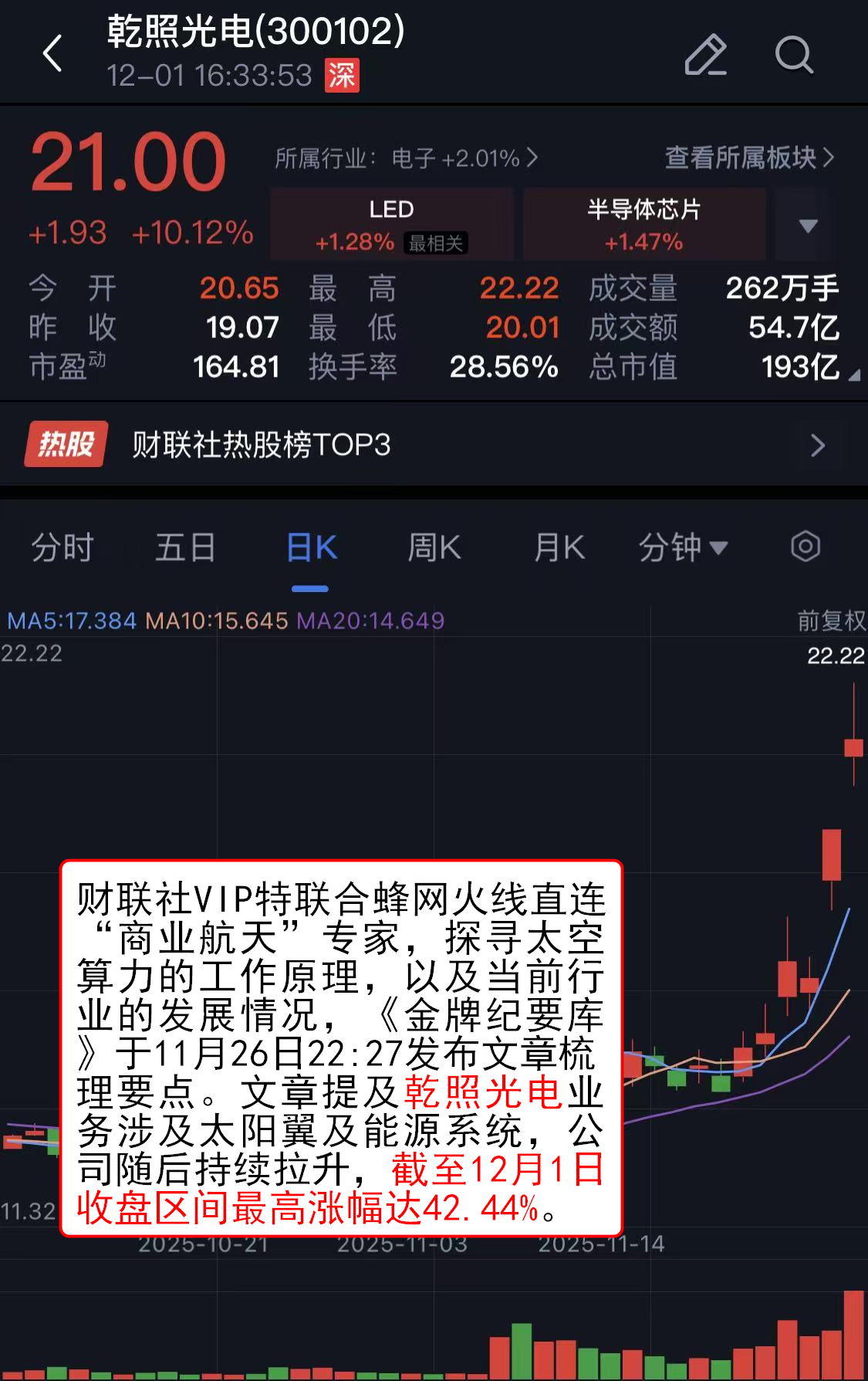 财联社VIP特联合蜂网火线直连“商业航天”专家,探寻太空算力的工作原理,以及当前行业的发展情况,《金牌纪要库》于11月26日22:27发布文章梳理要点。文章提及乾照光电业务涉及太阳翼及能源系统,公司随后持续拉升,截至12月1日收盘区间最高涨幅达42.44%。