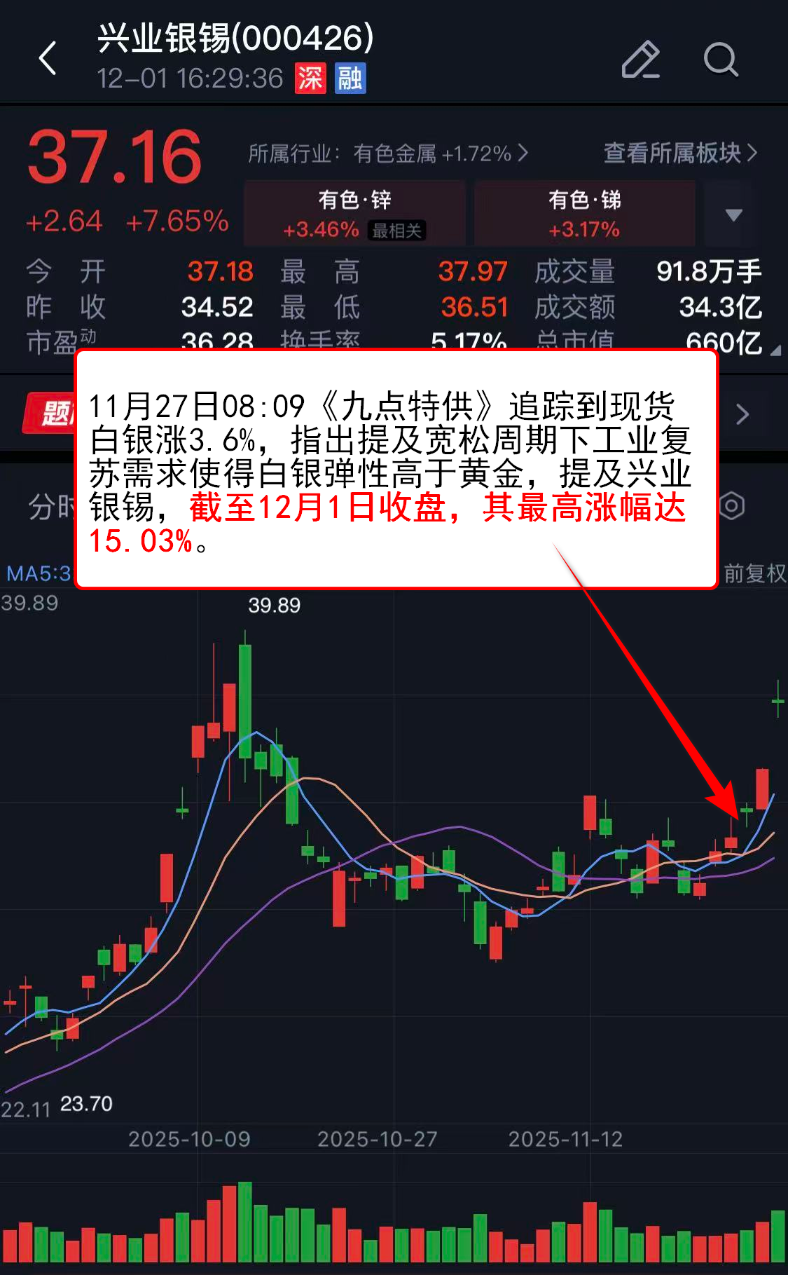 11月27日08:09《九点特供》追踪到现货白银涨3.6%,指出提及宽松周期下工业复苏需求使得白银弹性高于黄金,提及兴业银锡,截至12月1日收盘,其最高涨幅达15.03%。