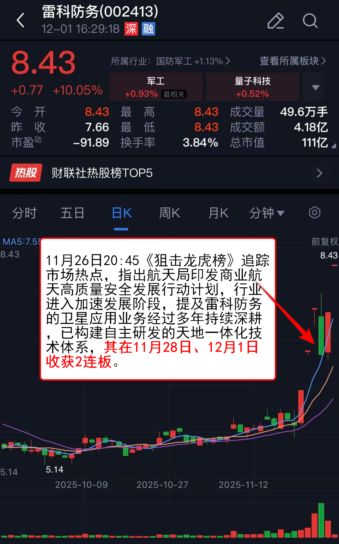 11月26日20:45《狙击龙虎榜》追踪市场热点,指出航天局印发商业航天高质量安全发展行动计划,行业进入加速发展阶段,提及雷科防务的卫星应用业务经过多年持续深耕,已构建自主研发的天地一体化技术体系,其在11月28日、12月1日收获2连板。