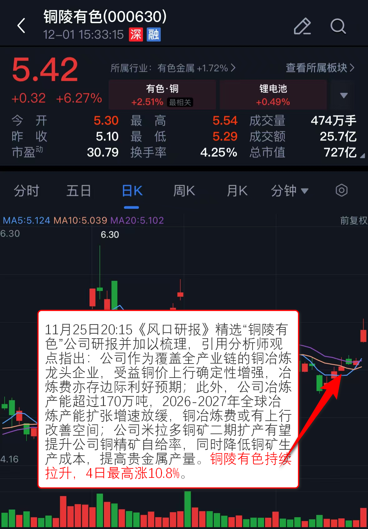 11月25日20:15《风口研报》精选“铜陵有色”公司研报并加以梳理,引用分析师观点指出:公司作为覆盖全产业链的铜冶炼龙头企业,受益铜价上行确定性增强,冶炼费亦存边际利好预期;此外,公司冶炼产能超过170万吨,2026-2027年全球冶炼产能扩张增速放缓,铜冶炼费或有上行改善空间;公司米拉多铜矿二期扩产有望提升公司铜精矿自给率,同时降低铜矿生产成本,提高贵金属产量。铜陵有色持续拉升,4日最高涨10.8%。