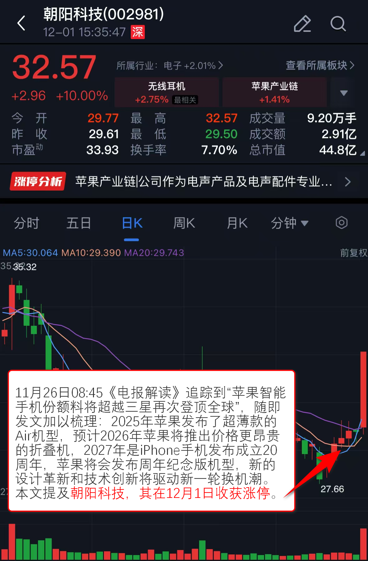 11月26日08:45《电报解读》追踪到“苹果智能手机份额料将超越三星再次登顶全球”,随即发文加以梳理:2025年苹果发布了超薄款的Air机型,预计2026年苹果将推出价格更昂贵的折叠机,2027年是iPhone手机发布成立20周年,苹果将会发布周年纪念版机型,新的设计革新和技术创新将驱动新一轮换机潮。本文提及朝阳科技,其在12月1日收获涨停。