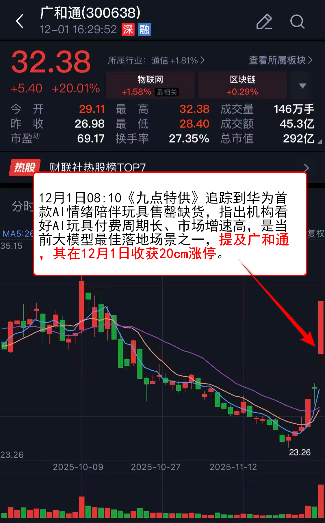 12月1日08:10《九点特供》追踪到华为首款AI情绪陪伴玩具售罄缺货,指出机构看好AI玩具付费周期长、市场增速高,是当前大模型最佳落地场景之一,提及广和通,其在12月1日收获20cm涨停。