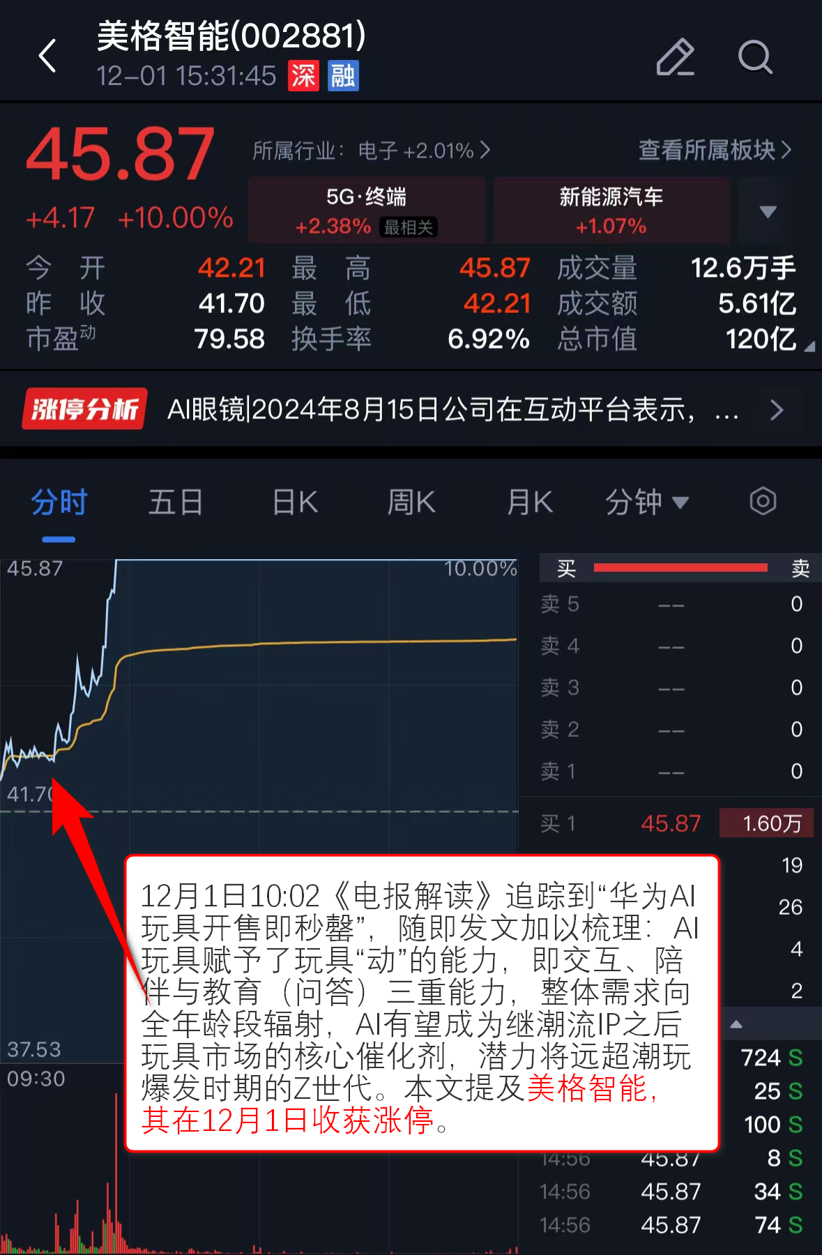 12月1日10:02《电报解读》追踪到“华为AI玩具开售即秒罄”,随即发文加以梳理:AI玩具赋予了玩具“动”的能力,即交互、陪伴与教育(问答)三重能力,整体需求向全年龄段辐射,AI有望成为继潮流IP之后玩具市场的核心催化剂,潜力将远超潮玩爆发时期的Z世代。本文提及美格智能,其在12月1日收获涨停。