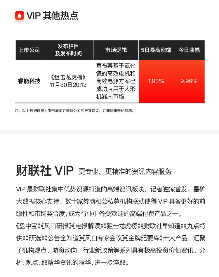 注:财联社VIP为内容资讯产品,并非投资建议。以下内容仅为资讯价值展示非对相关公司的推荐建议,非未来走势预测。投资有风险,入市需谨慎。