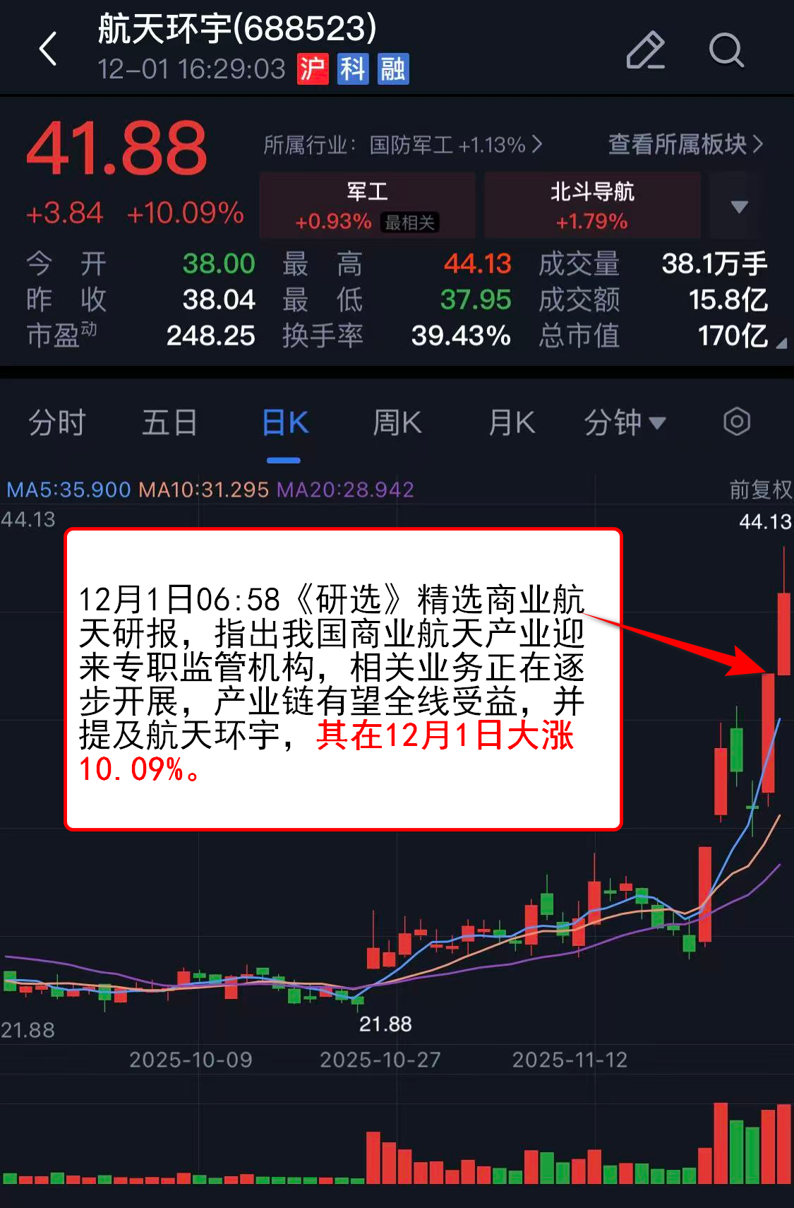 12月1日06:58《研选》精选商业航天研报,指出我国商业航天产业迎来专职监管机构,相关业务正在逐步开展,产业链有望全线受益,并提及航天环宇,其在12月1日大涨10.09%。