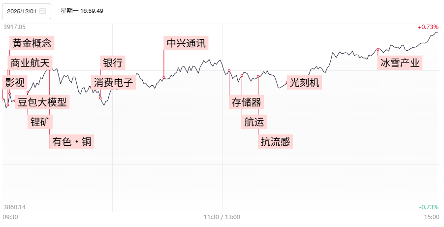 财联社12月1日讯,今日65股涨停,27股炸板,封板率为72%,金富科技6连板,海欣食品、海王生物4连板,通宇通讯、道明光学、睿能科技3连板,国晟科技16天11板,航天发展12天8板,实达集团8天6板,雷科防务6天5板,北交所豪声电子30cm首板。市场震荡拉升,沪指重返3900点上方,深成指、创业板指均涨超1%。沪深两市成交额1.87万亿,较上一个交易日放量2881亿。盘面上,市场热点快速轮动,全市场近3400只个股上涨。板块方面,消费电子、有色金属等板块涨幅居前,互联网电商、保险、电池等板块跌幅居前。截至收盘,沪指涨0.65%,深成指涨1.25%,创业板指涨1.31%。