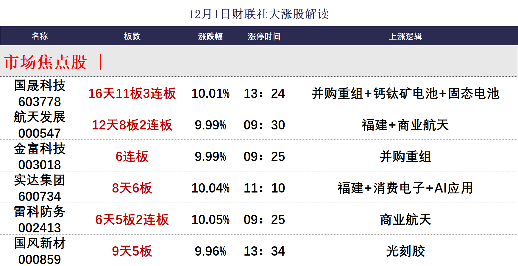 据报道,国家航天局已于近期设立商业航天司,这标志着我国商业航天产业迎来专职监管机构。上周表现火热的商业航天概念维持强势,航天发展、顺灏股份、银河电子、通宇通讯均实现连板晋级,航宇微、乾照光电、航天环宇均涨超10%,并未受到原定11月29日实施首飞任务的朱雀三号可回收火箭的延迟发射的影响。随着商业航天概念上周五迎来短线高潮后,今日板块整体仍呈现较强承接,特别是几只20厘米人气股仍维持高溢价,因此后续板块内部仍存分化需求,短线仍不应盲目追涨,静待分歧释放后的核心低吸机会。