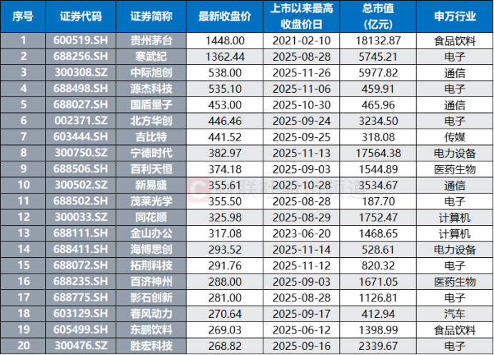 目前,贵州茅台以1448元的价格仍位居A股股价榜首,寒武纪次之,股价报收于1362.44元。此外,中际旭创、源杰科技、国盾量子、北方华创、吉比特、宁德时代、百利天恒、新易盛等股股价也居前。值得注意的是,在股价前20只标的中,共有18只个股在今年录得历史最高收盘价,若以月份来统计,其在今年8月、9月、11月期间收盘价历史新高较多。