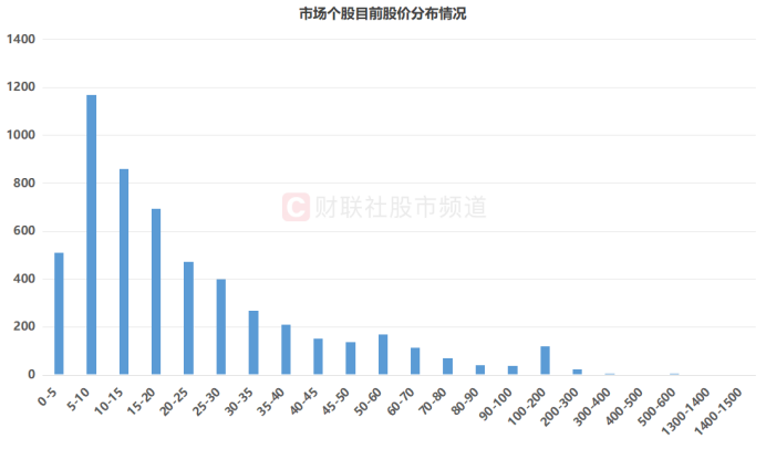 个股层面来看,目前市场个股仍以50元以下股较多,其合计占比近90%。以细分层级统计,股价在5元至10元的个股、10元至15元的个股、15元至20元的个股、5元以下的个股数量相对较多,分别占比近21.5%、15.7%、12.7%、9.3%,其四者合计比例接近一半。此外,目前百元股共156只,占比达2.9%,其中,千元股仅有2只,为贵州茅台、寒武纪。