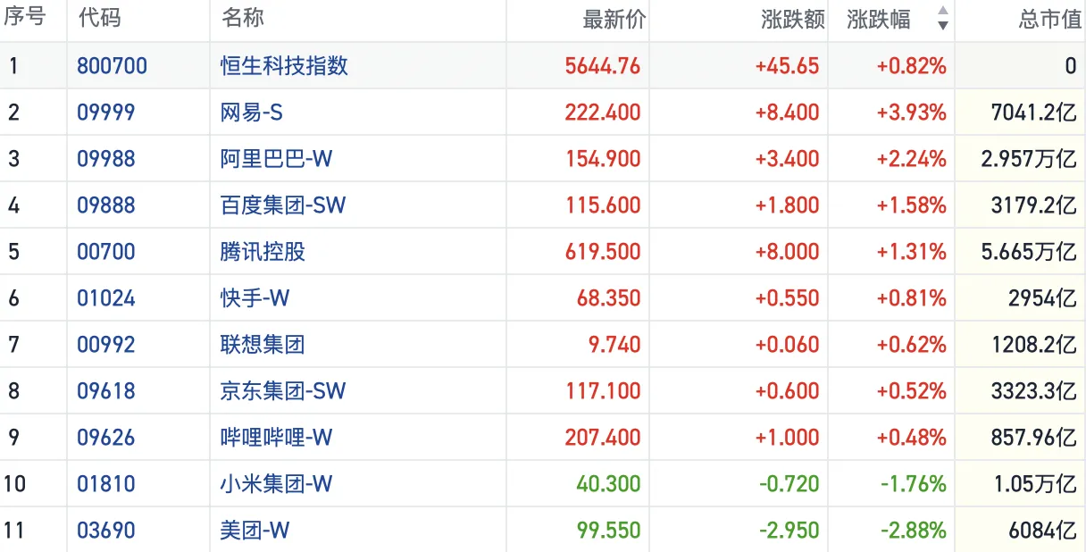 盘面上,大型科网股多数上行,其中,网易涨近4%,阿里巴巴涨超2%,百度、腾讯涨超1.3%,京东小幅上涨0.52%,美团逆势跌近3%。