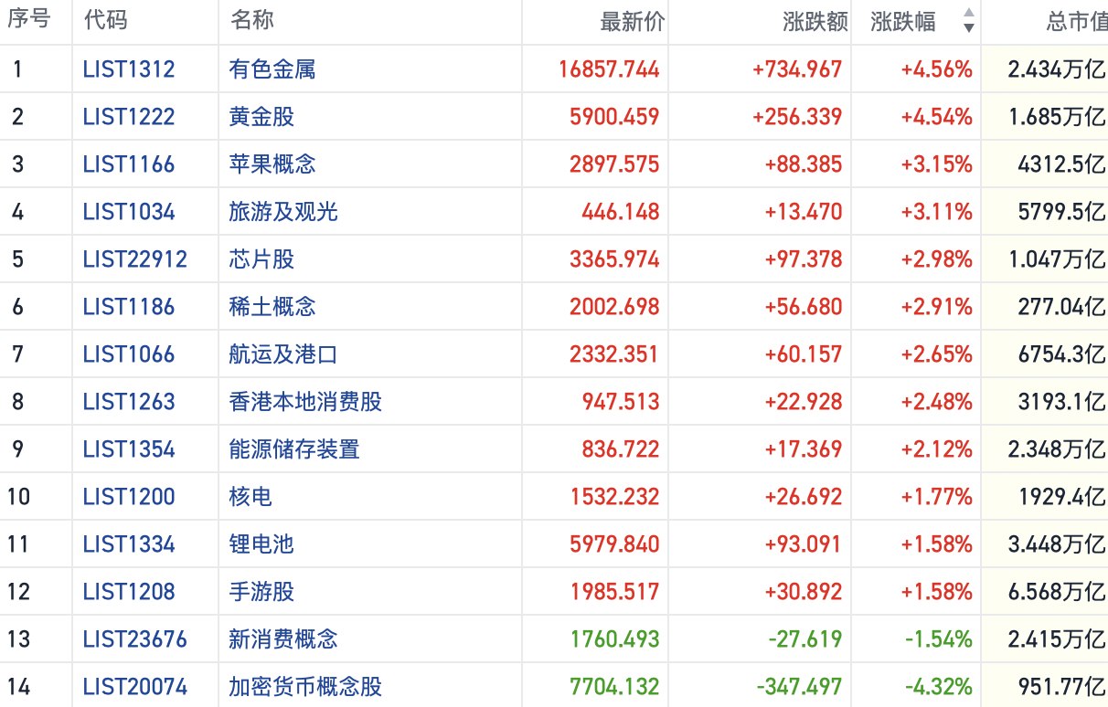 其他方向上,黄金、有色板块再现强势行情。此外,半导体、消费电子、AI应用等概念相继走强。锂电、航空、航运、餐饮等也行业也表现活跃。