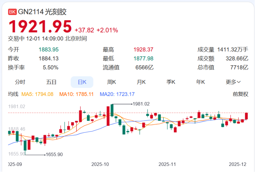 银河证券表示,“十五五”规划重点聚焦关键核心技术领域的自主突破,设备等领域是直接受益环节之一;而光刻胶作为半导体制造的核心耗材,其本土化替代需求将随政策推进持续释放,据市场三方机构数据统计,预计2025年光刻胶市场规模可达123亿元。