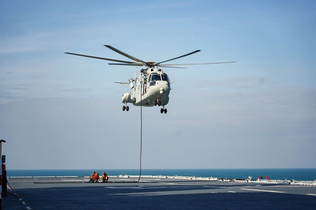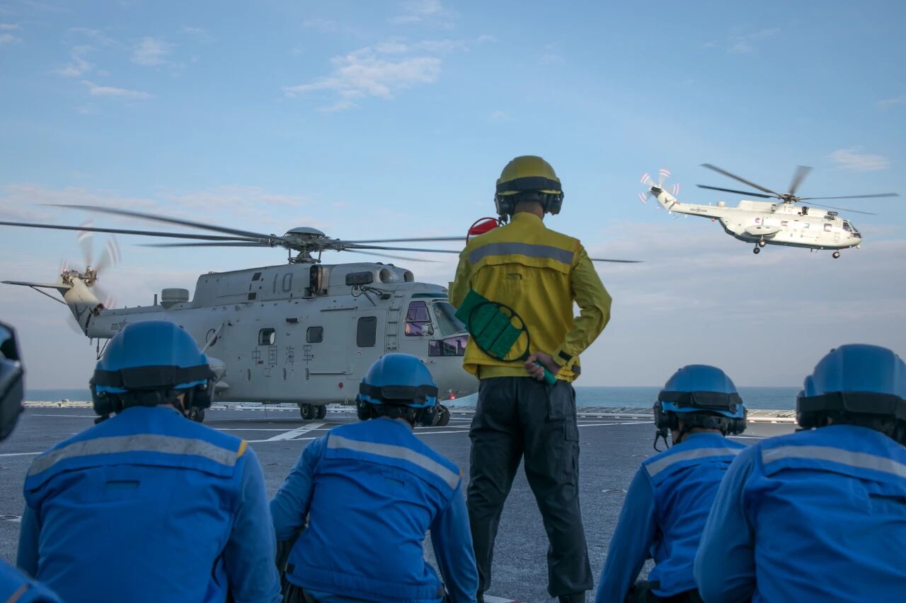 “可以起飞!”在湖北舰甲板上,甲板引导员解开直升机与甲板系留绳索,数架舰载直升机从宽阔的甲板腾空而起,随即围绕快速起降,悬停加油等课目,展开专攻精练。