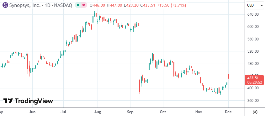 受该消息影响,新思科技(股票代码:SNPS)股价盘前一度涨超11%至每股464美元。截至发稿,新思科技早盘的涨幅约为3.7%,报433.5美元。