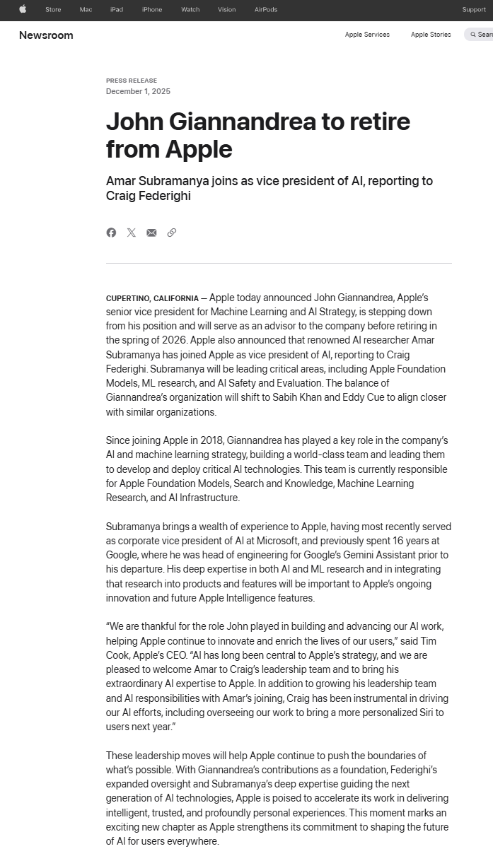 声明称:“我们非常感谢约翰在构建和推进我们的人工智能工作中所发挥的作用,他帮助苹果持续创新,丰富用户的生活。人工智能一直是苹果战略的核心,我们很高兴欢迎阿玛尔加入克雷格的领导团队,并将他卓越的人工智能专业知识带到苹果。”