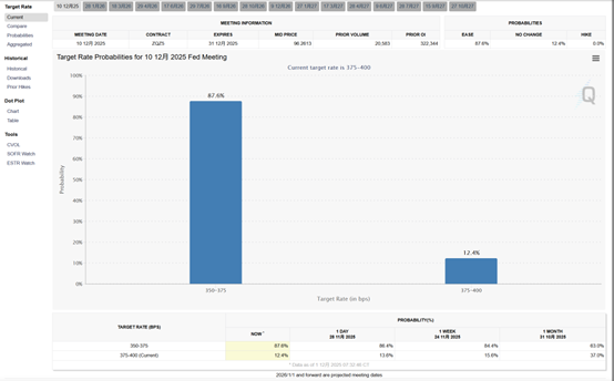 美联储定于12月9日和10日举行下一次政策会议。据CME“美联储观察”,眼下美联储12月维持利率不变的概率为12.4%,降息25个基点的概率为87.6%。