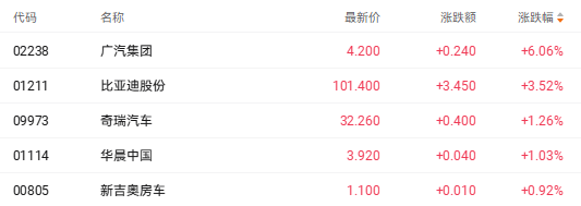 财联社12月2日讯(编辑 胡家荣)港股汽车股今日表现亮眼。截至发稿,广汽集团(02238.HK)涨6.06%、比亚迪股份(01211.HK)涨3.52%、奇瑞汽车(09973.HK)涨1.26%、华晨中国(01114.HK)涨1.03%。