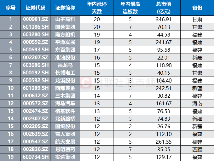 具体个股来看,以年内涨停次数前五的甘肃、海南、新疆、福建、西藏板块统计,剔除ST股,累计共有37股今年录得10次及以上涨停。其中,山子高科、国芳集团、南方路机、平潭发展、东百集团、准油股份涨停次数较多,分别达20次、20次、19次、19次、17次、15次,福龙马、长城电工、龙溪股份、西部黄金、三木集团等股也较为活跃。