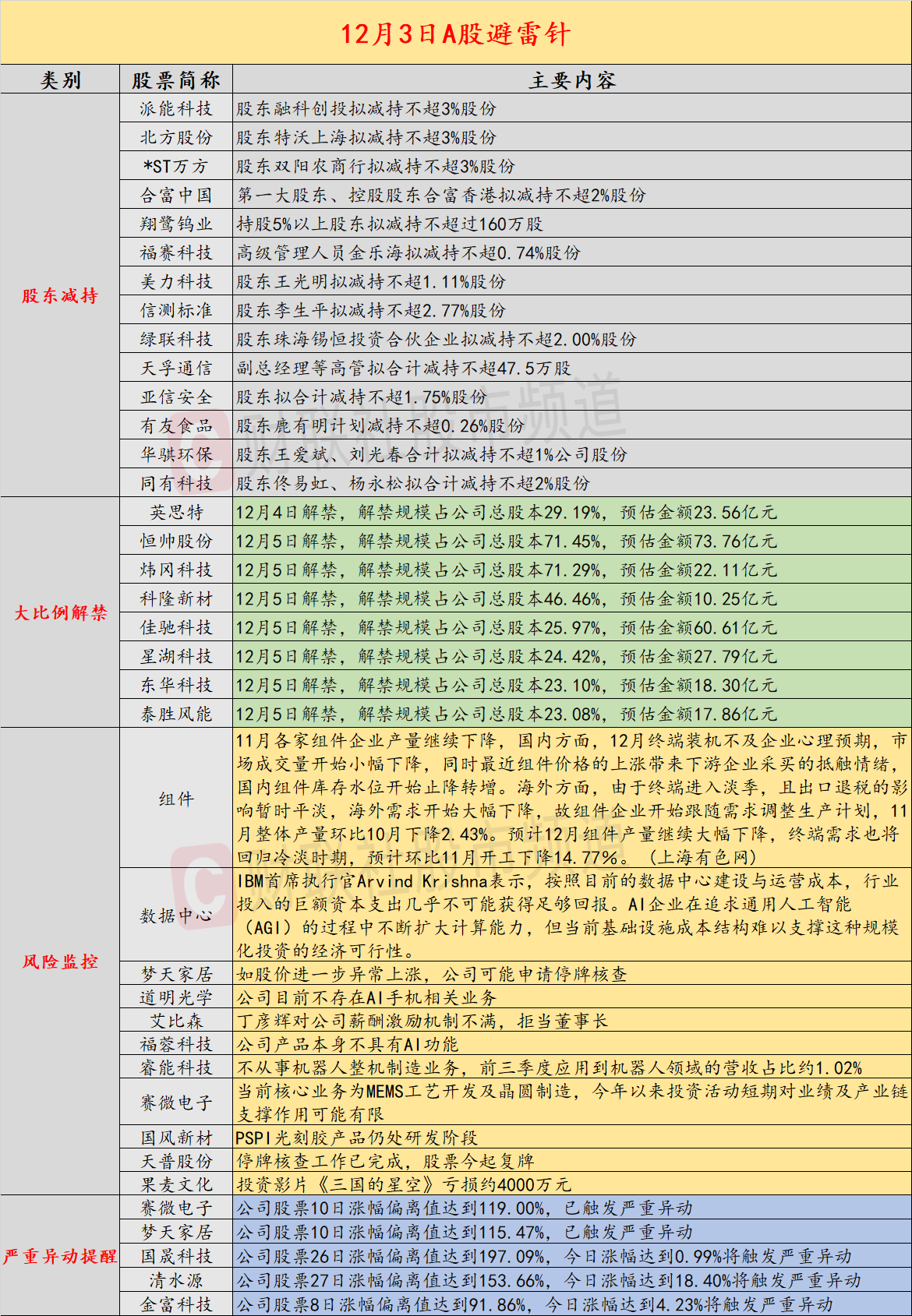 导读:财联社12月3日投资避雷针,近日,A股及海外市场潜在风险事件如下。国内经济信息方面包括:1)国内商品期市夜盘收盘多数下跌,非金属建材跌幅居前;2)12月组件排产预计大降,终端需求将回归冷淡时期;公司方面重点关注包括:1)10天7板梦天家居表示,如股价进一步异常上涨,公司可能申请停牌核查;2)4连板道明光学公告,公司目前不存在AI手机相关业务;海外市场重点关注包括:1)纳斯达克中国金龙指数收跌0.65%,热门中概股多数下跌;2)IBM CEO称以现有成本建设AI数据中心“几乎不可能回本”。