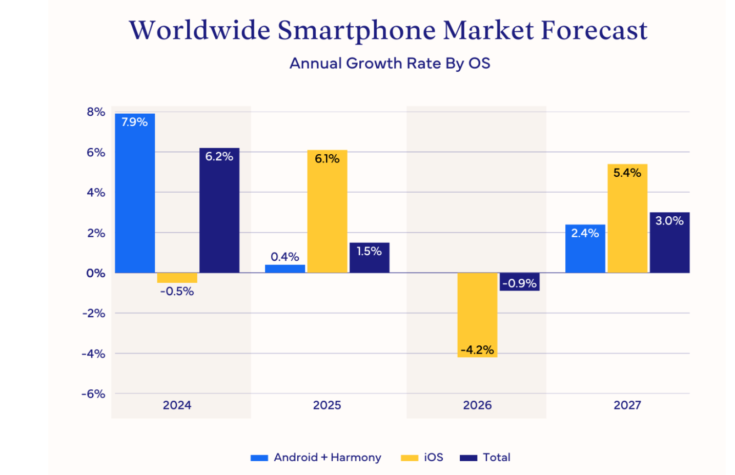 与此同时,苹果公司推迟其下一代入门级iPhone机型的发布时间(从2026年秋季推迟至2027年初),也将使iOS手机的出货量下降超过4%。