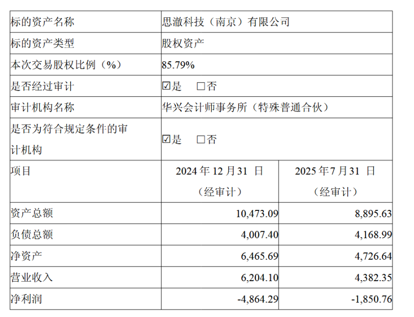 报告期内,思澈科技资产总额分别为10473.09万元、8895.63万元;负债总额分别为4007.40万元、4168.99万元;净资产分别为6465.69万元、4726.64万元。