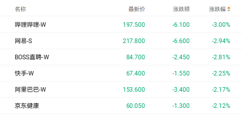 科技板块多数回调,哔哩哔哩-W(09626.HK)跌3%、网易-S(09999.HK)跌2.94%、快手-W(01024.HK)跌2.25%。