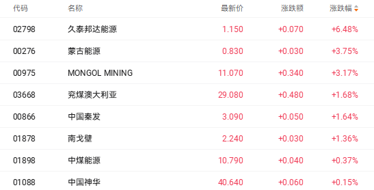 煤炭股集体上扬,蒙古能源(00276.HK)涨3.75%、中国秦发(00866.HK)涨1.64%、南戈壁(01878.HK)涨1.36%。