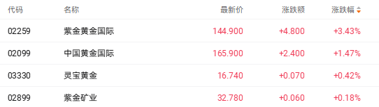 黄金股同样表现坚挺,紫金黄金国际(02259.HK)涨3.43%、中国黄金国际(02099.HK)涨1.47%、灵宝黄金(03330.HK)涨0.42%。