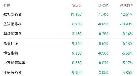 医药板块同样走弱,歌礼制药-B(01672.HK)跌12.51%、华领医药-B(02552.HK)跌8.14%、映恩生物-B(09606.HK)跌4.18%。