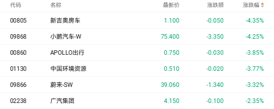 截至收盘,小鹏汽车-W(09868.HK)跌4.25%、蔚来-SW(09866.HK)跌3.32%、广汽集团(02238.HK)跌2.35%。