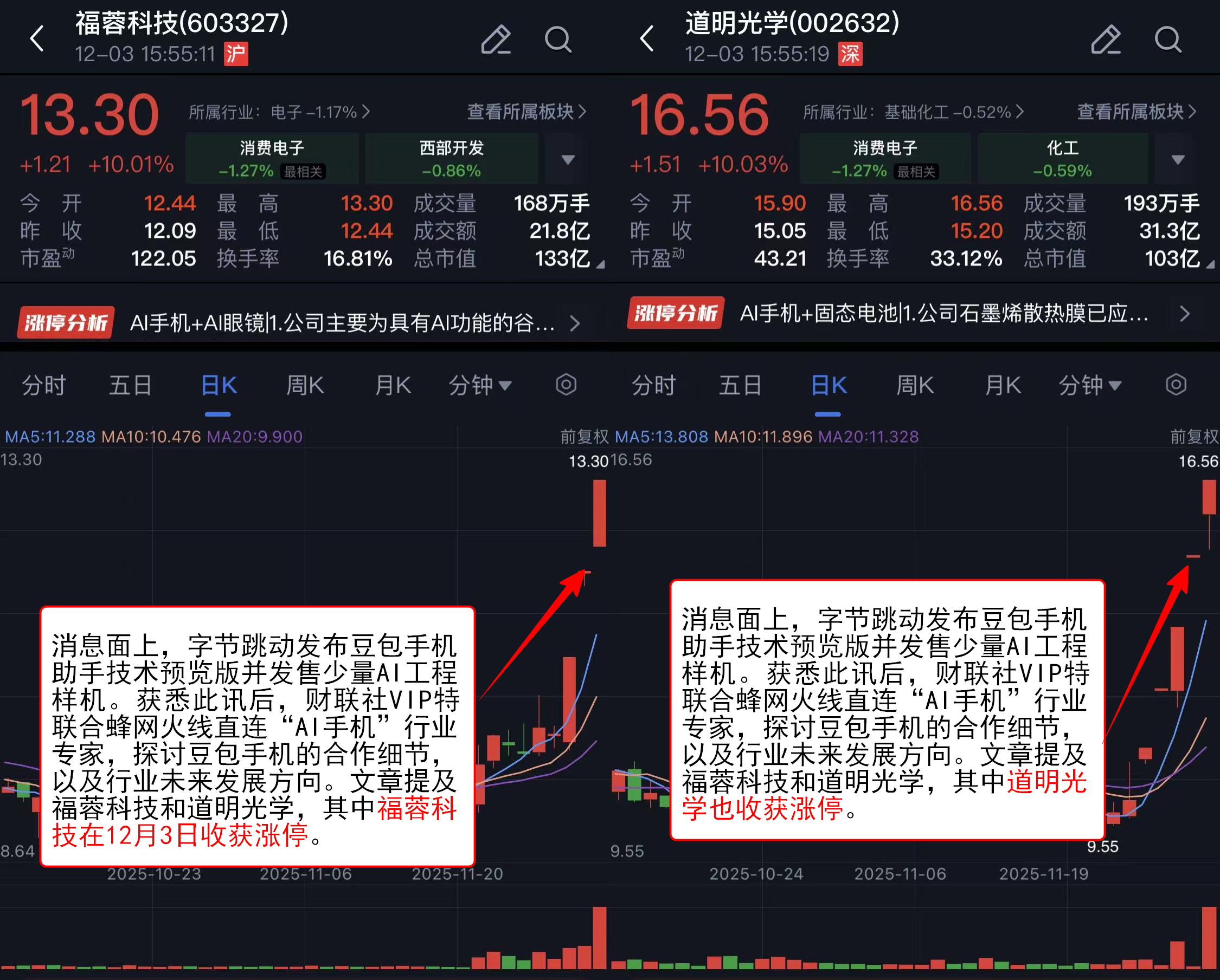消息面上,字节跳动发布豆包手机助手技术预览版并发售少量AI工程样机。获悉此讯后,财联社VIP特联合蜂网火线直连“AI手机”行业专家,探讨豆包手机的合作细节,以及行业未来发展方向。栏目在12月2日晚发文,文章提及二线厂商在AI底层技术上的积累较少,更愿意引入成熟的第三方大模型方案以降低研发成本。当AI成了系统级入口后,手机产商可以向服务提供商收取“竞价排名”或交易佣金,想象空间大。文章提及福蓉科技和道明光学,其中福蓉科技在12月3日收获涨停,道明光学也收获涨停。