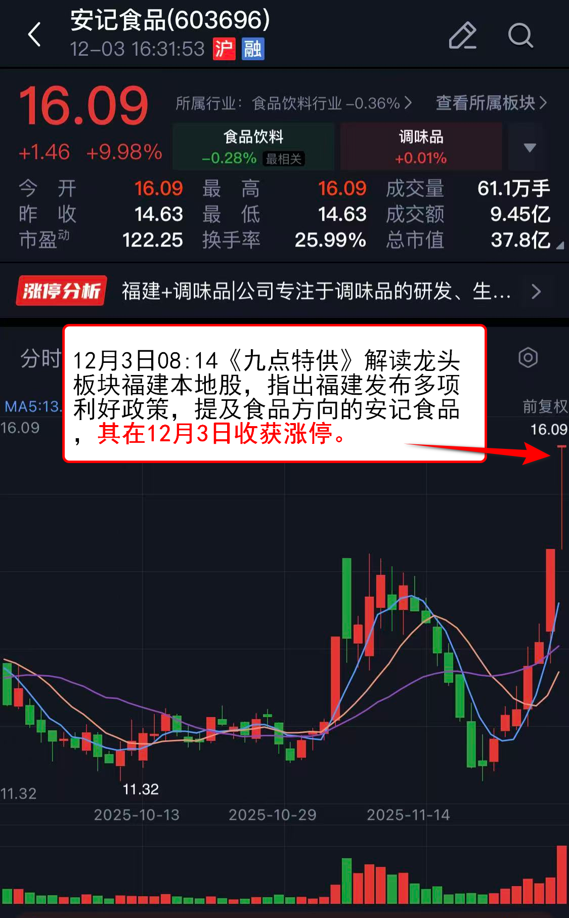 12月3日08:14《九点特供》解读龙头板块福建本地股,指出福建发布多项利好政策,提及食品方向的安记食品,其在12月3日收获涨停。
