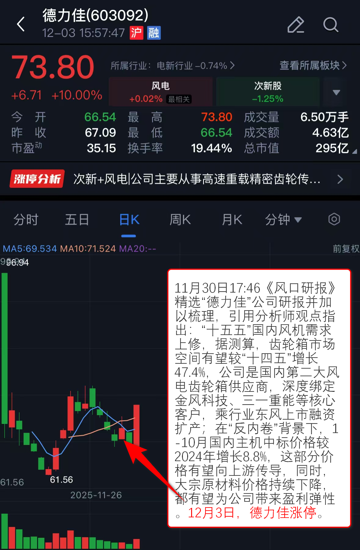 11月30日17:46《风口研报》精选“德力佳”公司研报并加以梳理,引用分析师观点指出:“十五五”国内风机需求上修,据测算,齿轮箱市场空间有望较“十四五”增长47.4%,公司是国内第二大风电齿轮箱供应商,深度绑定金风科技、三一重能等核心客户,乘行业东风上市融资扩产;在“反内卷”背景下,1-10月国内主机中标价格较2024年增长8.8%,这部分价格有望向上游传导,同时,大宗原材料价格持续下降,都有望为公司带来盈利弹性。12月3日,德力佳涨停。