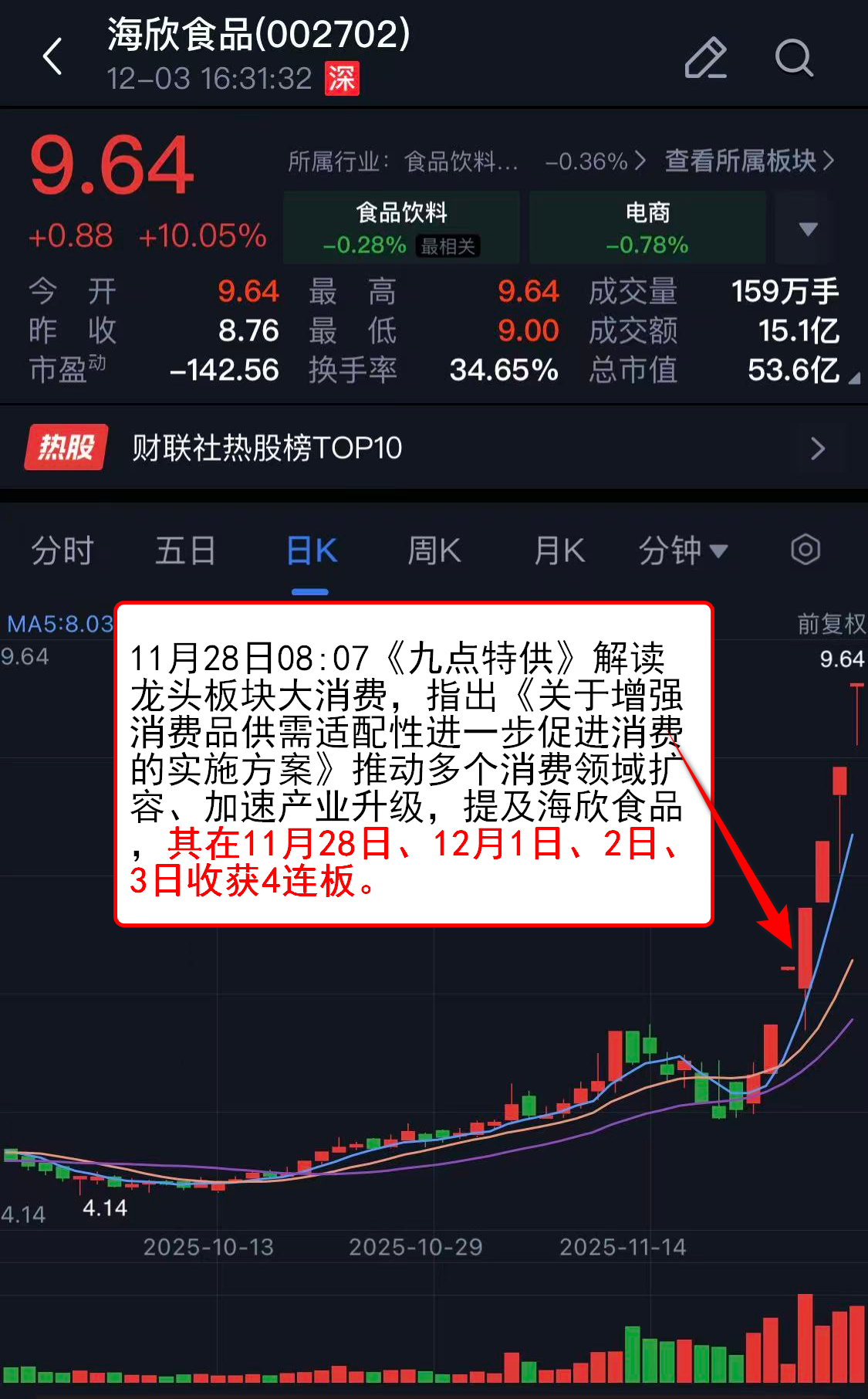 11月28日08:07《九点特供》解读龙头板块大消费,指出《关于增强消费品供需适配性进一步促进消费的实施方案》推动多个消费领域扩容、加速产业升级,提及海欣食品,其在11月28日、12月1日、2日、3日收获4连板。