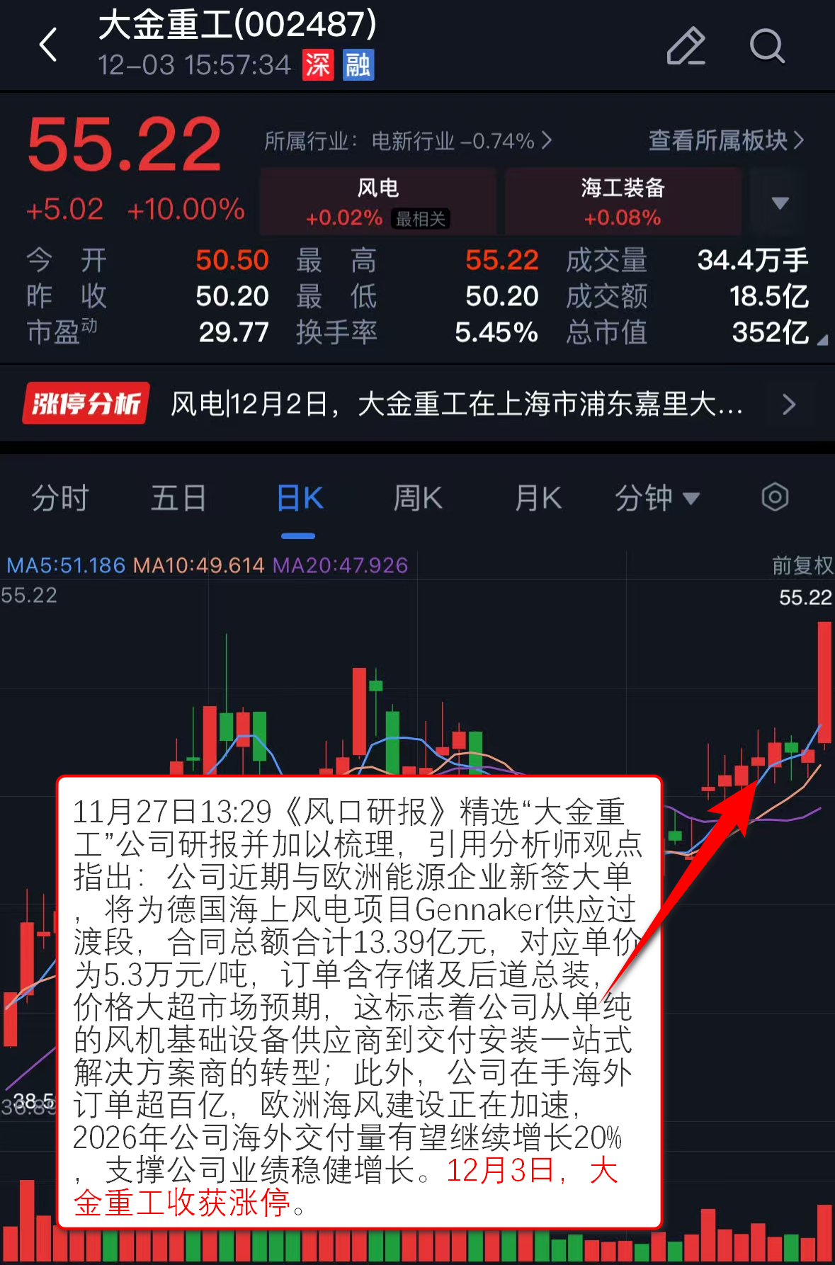 11月27日13:29《风口研报》精选“大金重工”公司研报并加以梳理,引用分析师观点指出:公司近期与欧洲能源企业新签大单,将为德国海上风电项目Gennaker供应过渡段,合同总额合计13.39亿元,对应单价为5.3万元/吨,订单含存储及后道总装,价格大超市场预期,这标志着公司从单纯的风机基础设备供应商到交付安装一站式解决方案商的转型;此外,公司在手海外订单超百亿,欧洲海风建设正在加速,2026年公司海外交付量有望继续增长20%,支撑公司业绩稳健增长。12月3日,大金重工收获涨停。