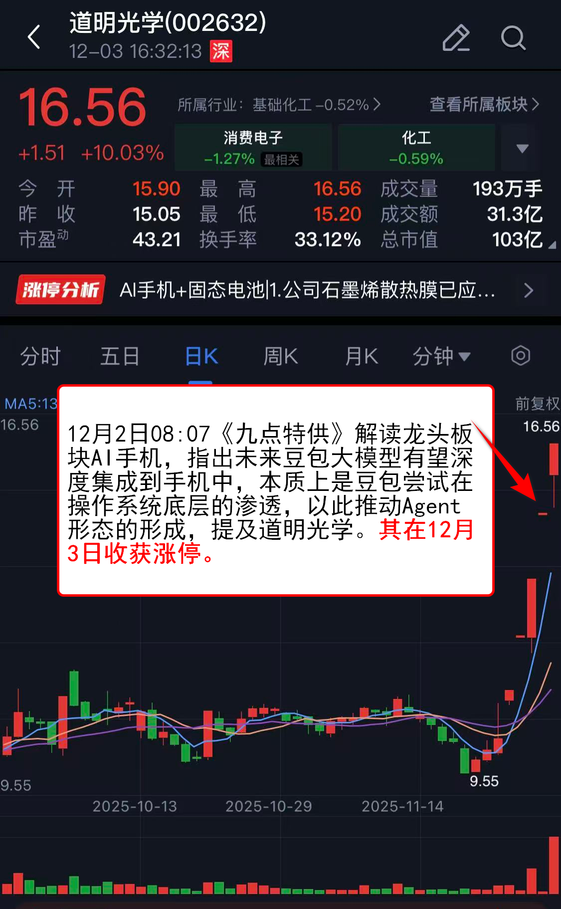 12月2日08:07《九点特供》解读龙头板块AI手机,指出未来豆包大模型有望深度集成到手机中,本质上是豆包尝试在操作系统底层的渗透,以此推动Agent形态的形成,提及道明光学。其在12月3日收获涨停。