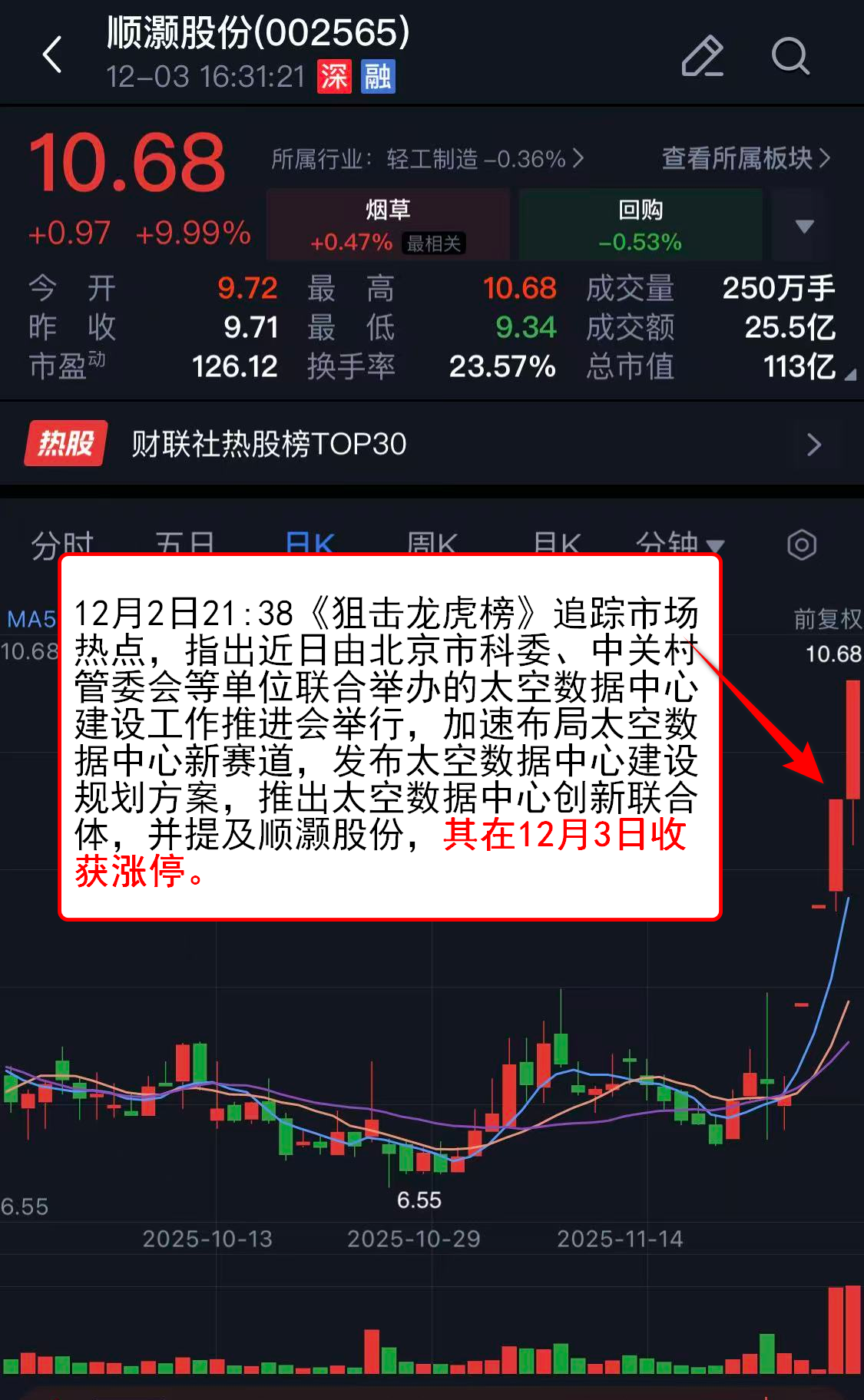 12月2日21:38《狙击龙虎榜》追踪市场热点,指出近日由北京市科委、中关村管委会等单位联合举办的太空数据中心建设工作推进会举行,加速布局太空数据中心新赛道,发布太空数据中心建设规划方案,推出太空数据中心创新联合体,并提及顺灏股份,其在12月3日收获涨停。