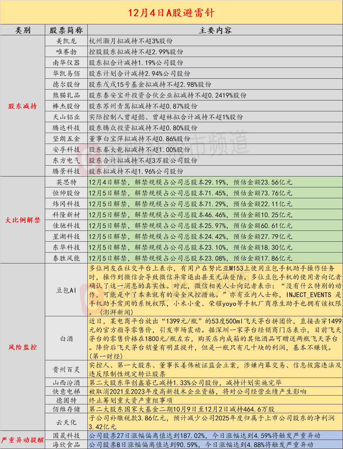 导读:财联社12月4日投资避雷针,近日,A股及海外市场潜在风险事件如下。国内经济信息方面包括:1)国内商品期市夜盘收盘多数下跌,化工品跌幅居前;2)豆包手机助手触发微信账号强制下线;公司方面重点关注包括:1)贵州百灵实控人、第一大股东、董事长姜伟被证监会立案,涉嫌内幕交易、信息披露违法及违反限制性规定转让股票;2)山西汾酒第二大股东华创鑫睿已减持1.33%公司股份,减持计划实施完毕;海外市场重点关注包括:1)纳斯达克中国金龙指数收跌1.38%;2)美国11月ADP就业人数减少3.2万人,不及市场预期。