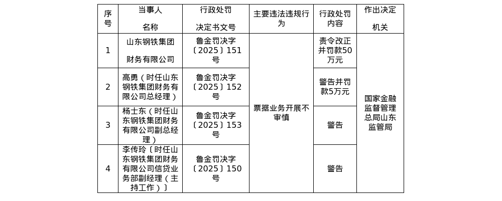 针对上述违法违规行为,国家金融监督管理总局山东监管局对山东钢铁集团财务有限公司罚款50万元;对高勇警告并处罚款5万元;对杨士东警告;对李传玲警告。