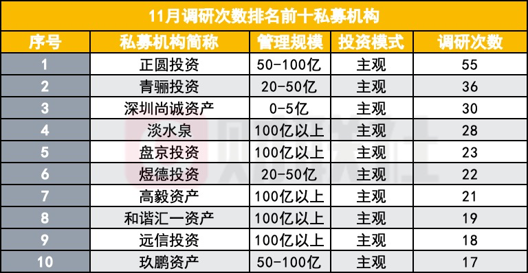 从11月调研活跃度排名看,正圆投资以55次居首,其调研范围覆盖电子、机械设备和电力设备等热门赛道。其次是青骊投资(36次)、深圳尚诚资产(30次),三者规模均在百亿以下。