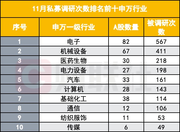 在行业层面,电子行业再次稳居调研榜第一,11月共有82只个股获得调研,合计调研次数高达567次,远超其他行业。不仅是被调研个股数量最多,其总调研次数也超过第二名机械设备行业的411次近四成。这已是电子行业连续数月占据私募调研热度榜首,说明其在投资者心中地位持续稳固。