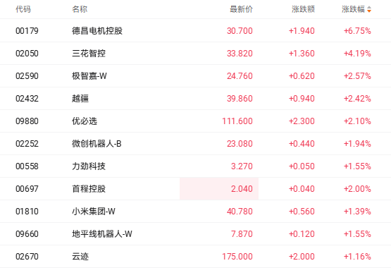 财联社12月4日讯(编辑 胡家荣)受益外围利好刺激,港股机器人概念股多数走强。截至发稿,三花智控(02050.HK)涨4.19%、极智嘉-W(02590.HK)涨2.57%、越疆(02432.HK)涨2.42%、优必选(09880.HK)涨2.10%。